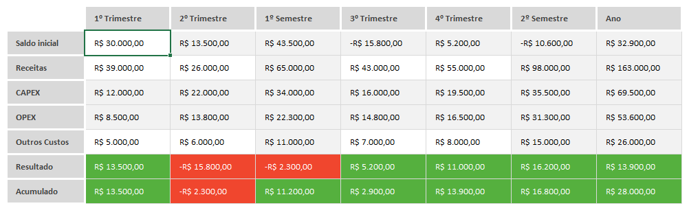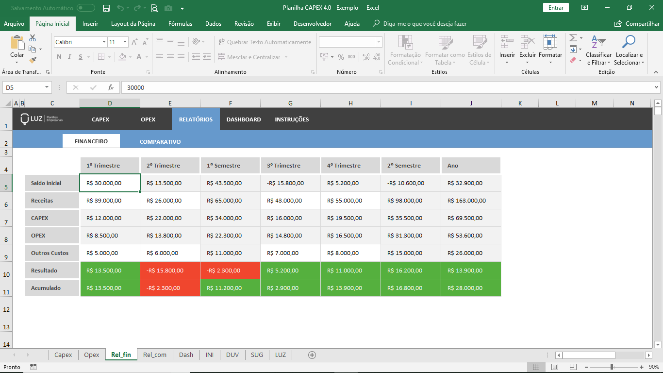 Área para fazer o controle financeiro do seu negócio que já busca os valores CAPEX e OPEX automaticamente de acordo com o preenchimento das abas anteriores