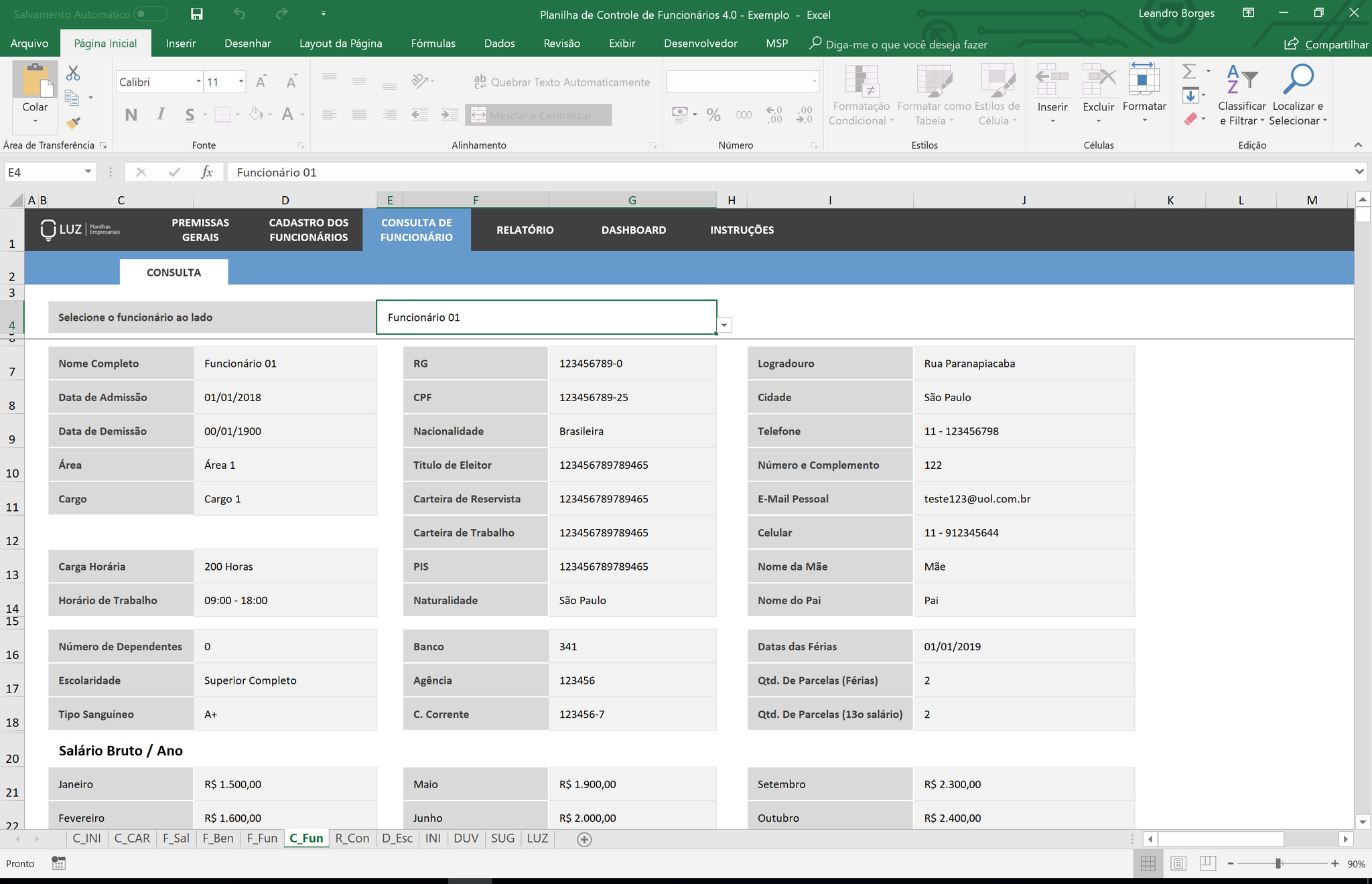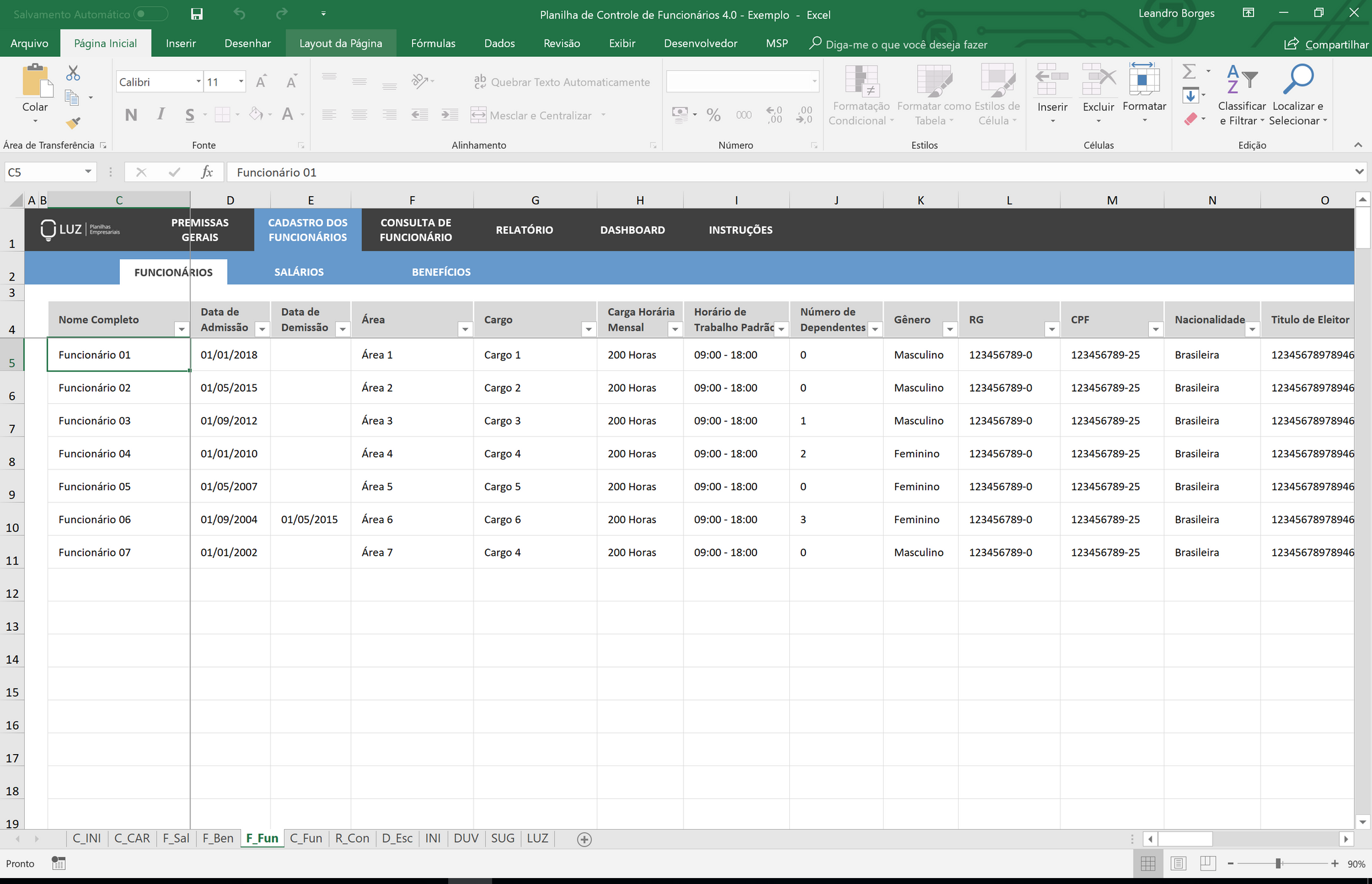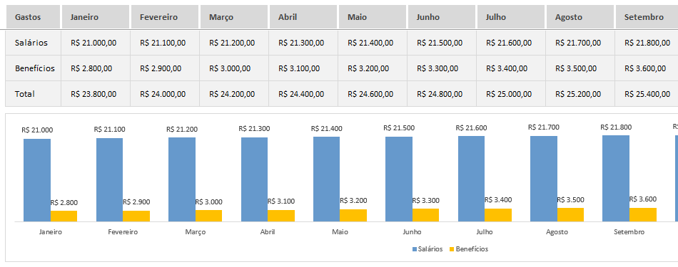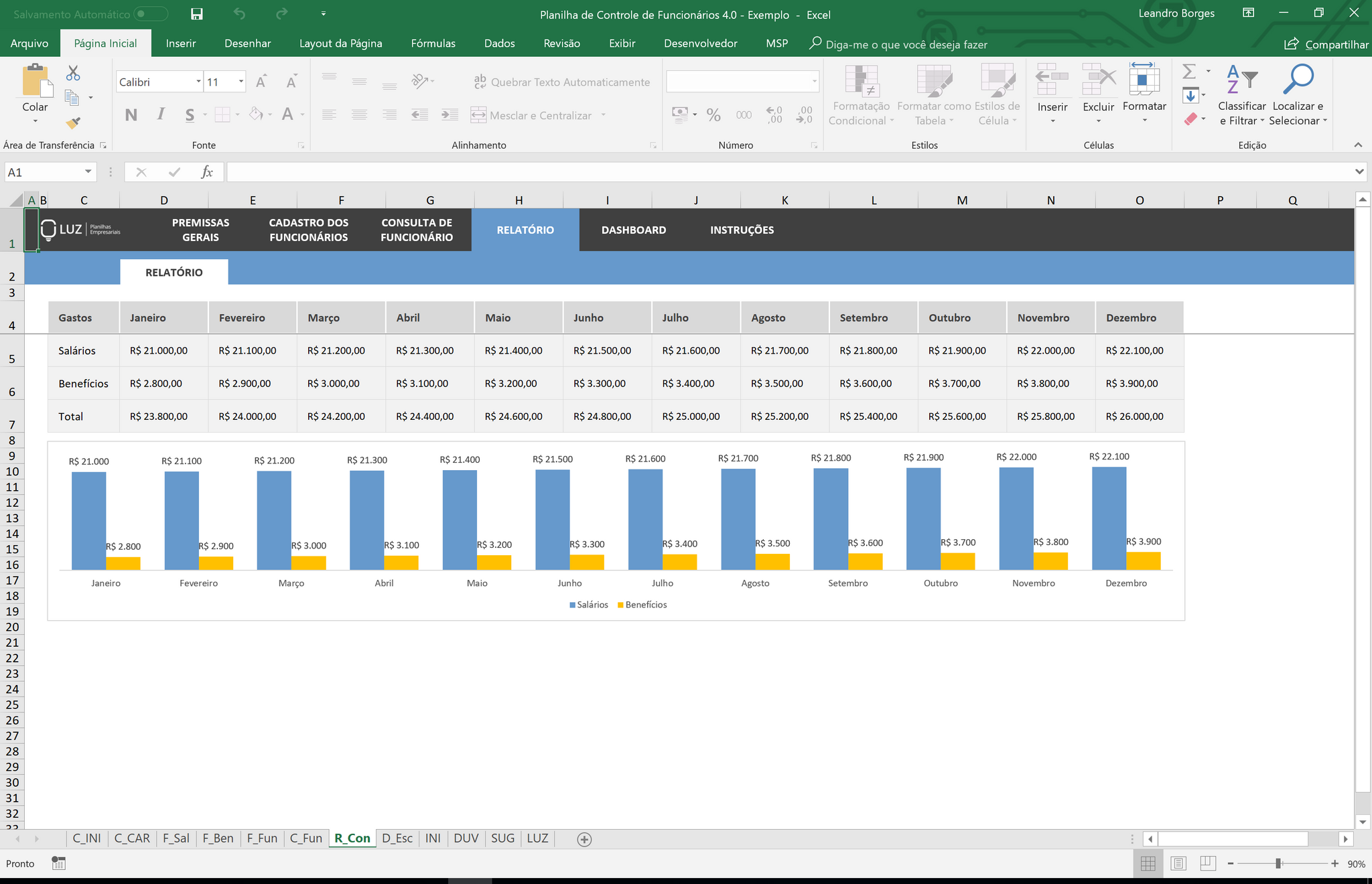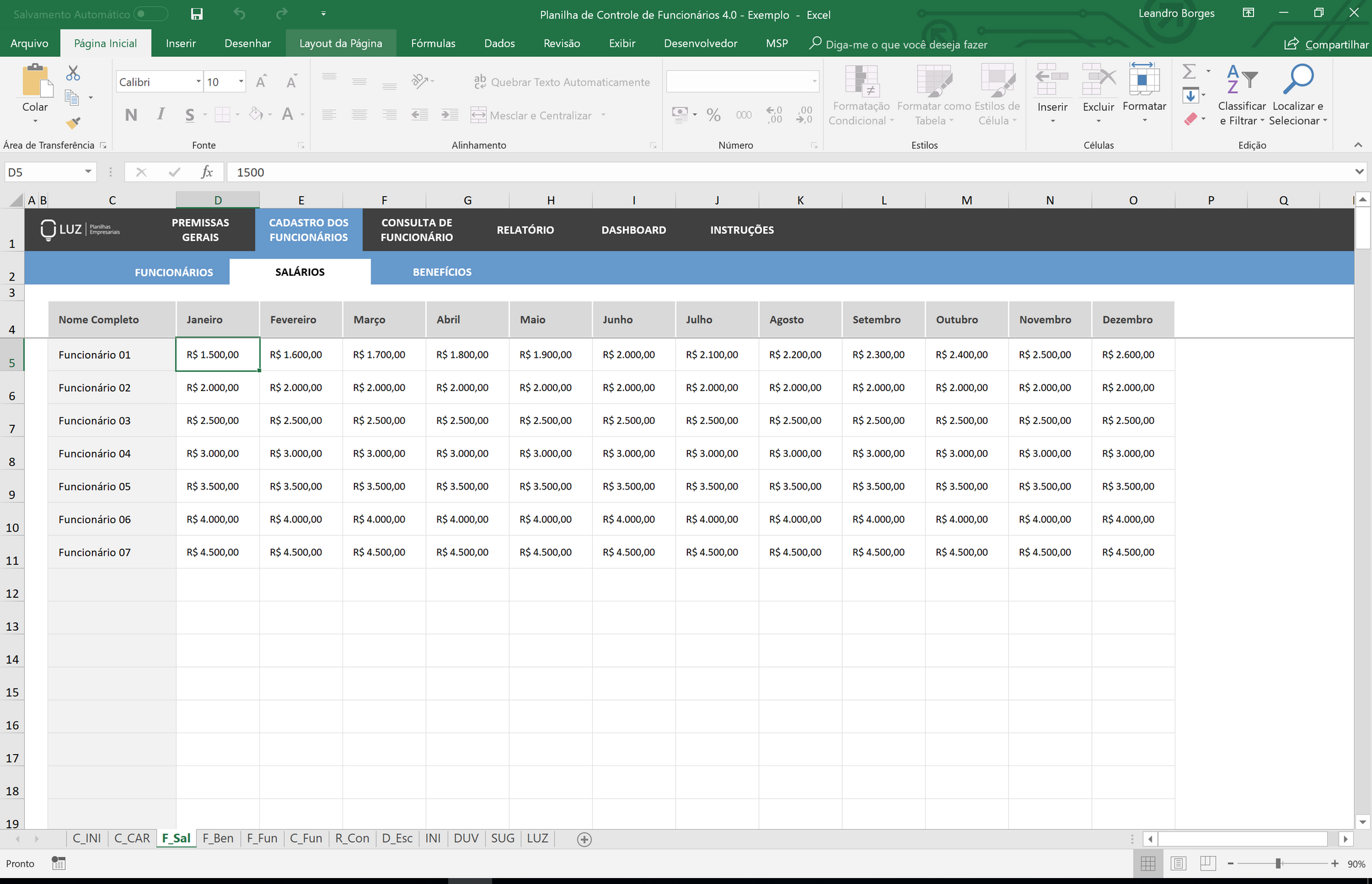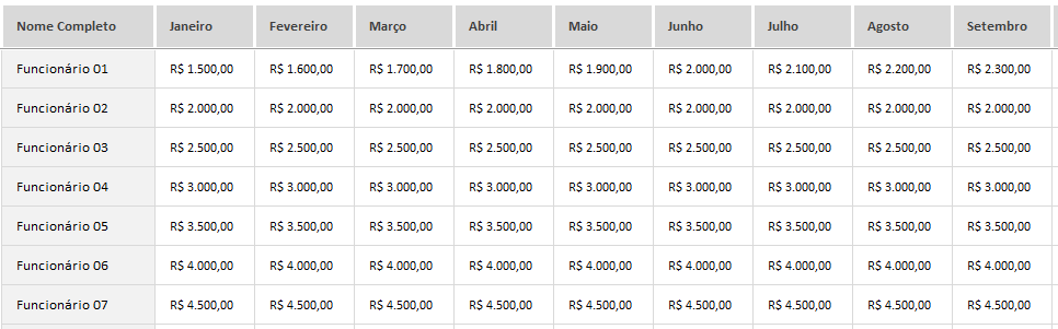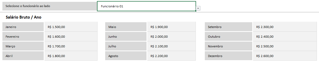 Nessa área da planilha você pode adicionar os valores de salários brutos e de benefícios mês a mês para cada um dos seus funcionários cadastrados
