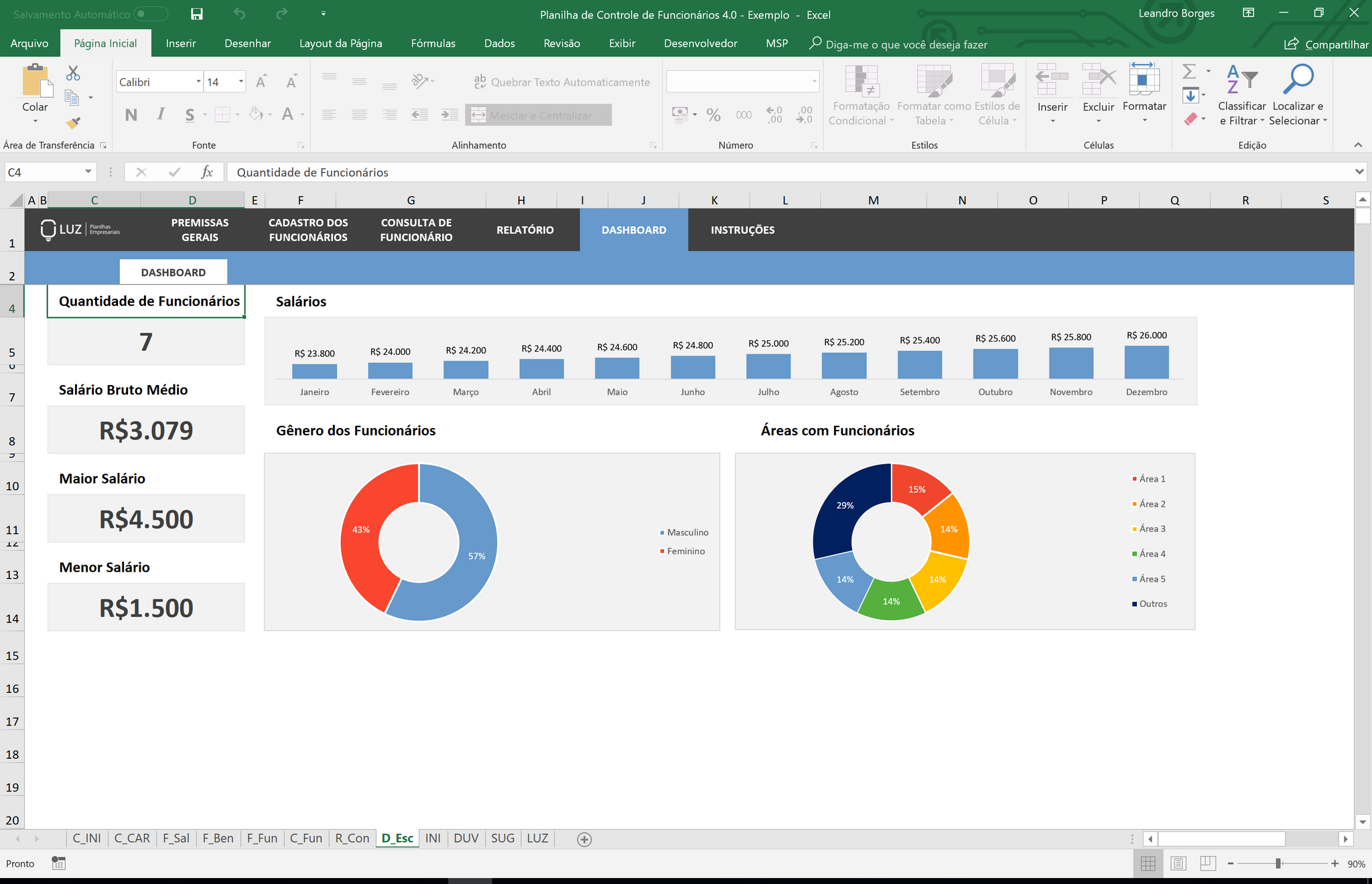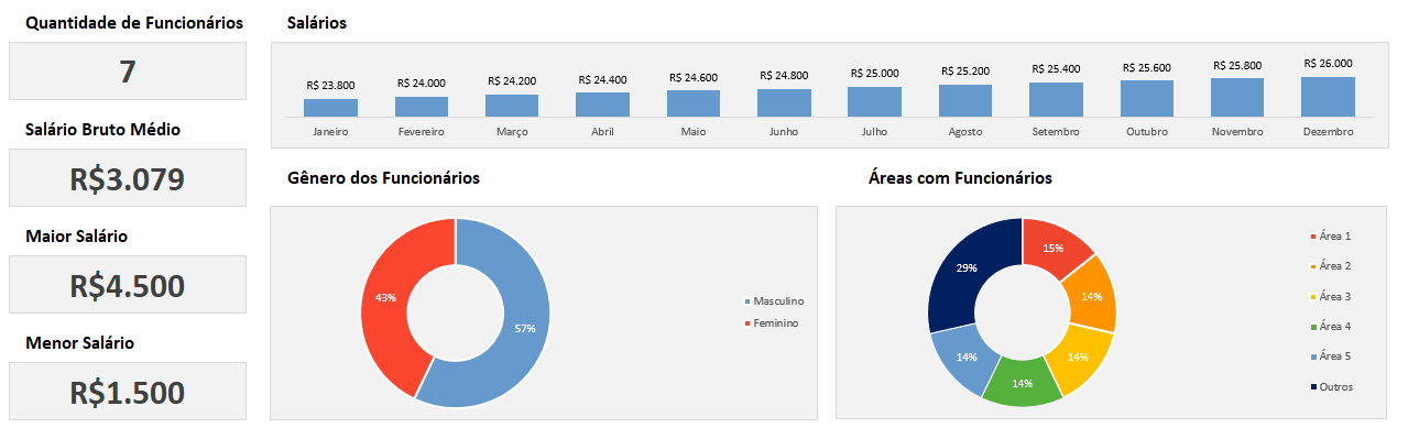 Acompanhe gráficos com o percentual de homens e mulheres, o percentual de funcionários por áreas e também veja indicadores com a quantidade de funcionários cadastrados, o salário médio de todos eles, o maior e o menor salário