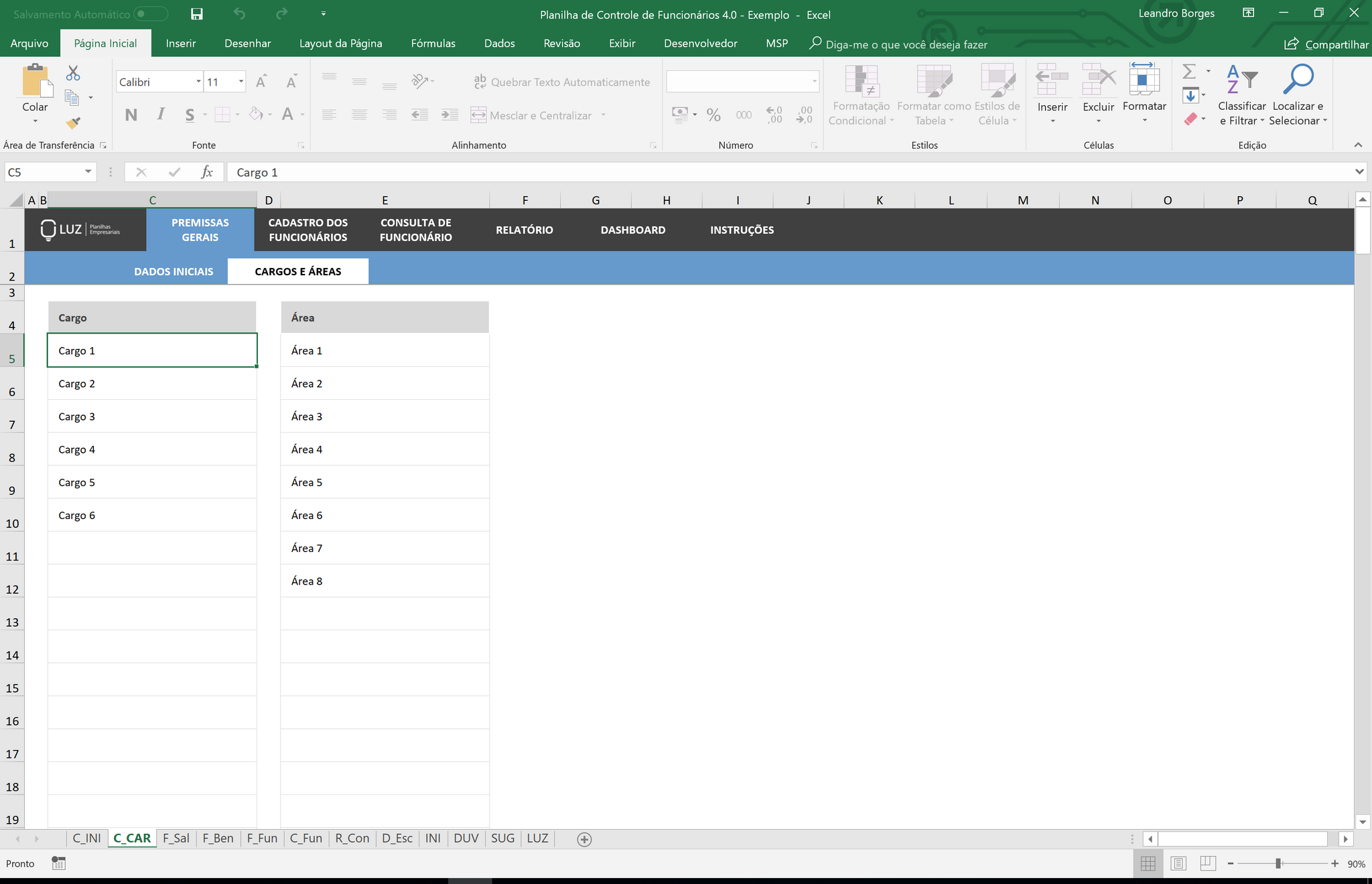Na primeira aba da planilha, você vai cadastrar todos os dados da empresa, bem como as áreas e cargos existentes