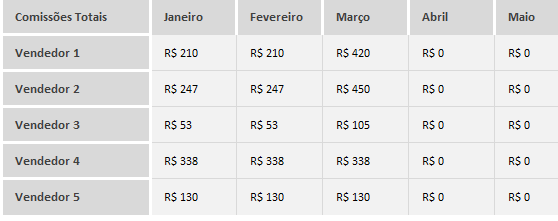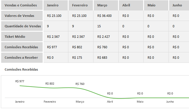 Automaticamente, a planilha vai gerar um compilado com todas as vendas por mês, assim como as comissões que foram geradas.