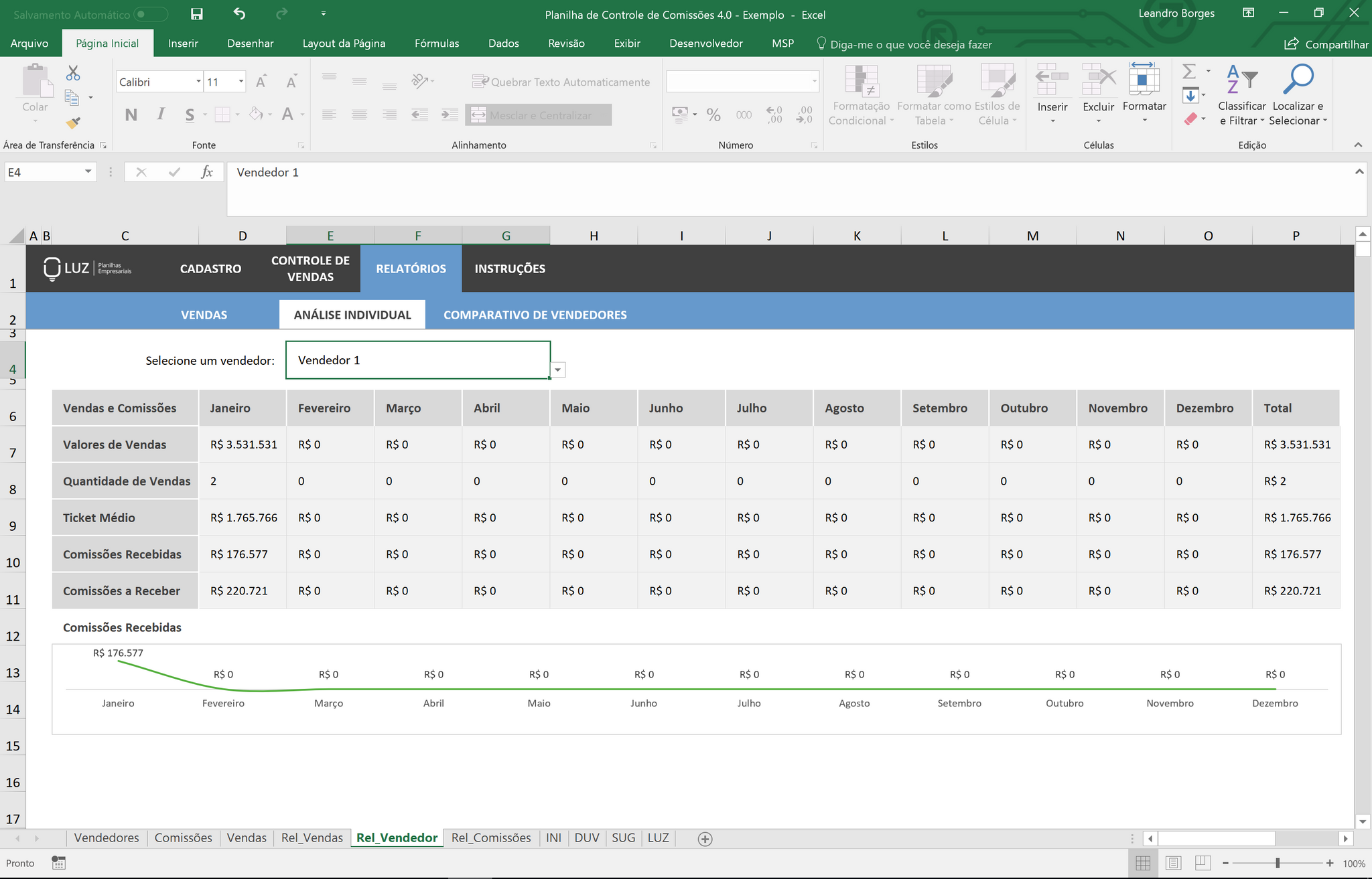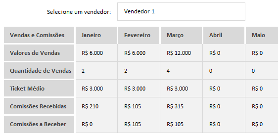 Além do relatório geral, a planilha também vai lhe permitir selecionar um determinado vendedor e analisar todas as suas métricas ao longo dos meses.