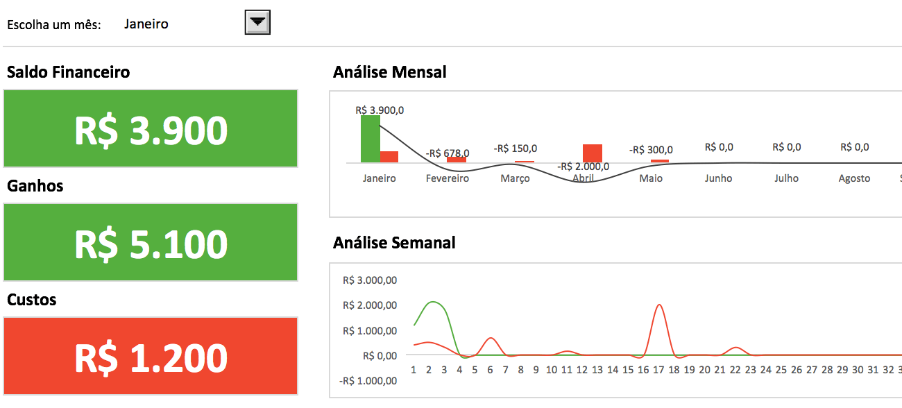 As suas finanças também serão automaticamente organizadas por mês e você vai poder ver em detalhes a evolução de custos e ganhos!