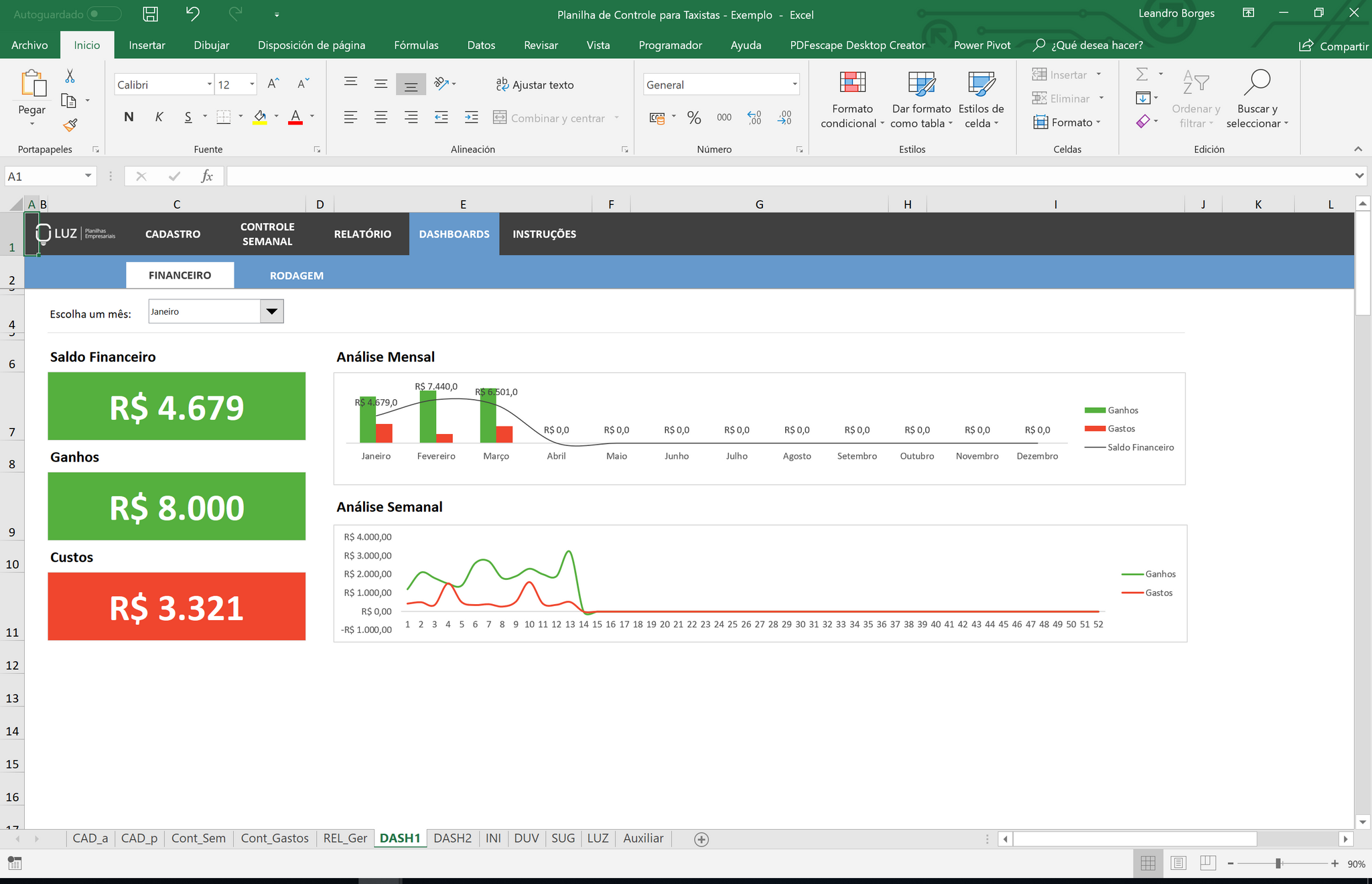 Planilha de controle financeiro e de rodagem para motoristas de Taxis.