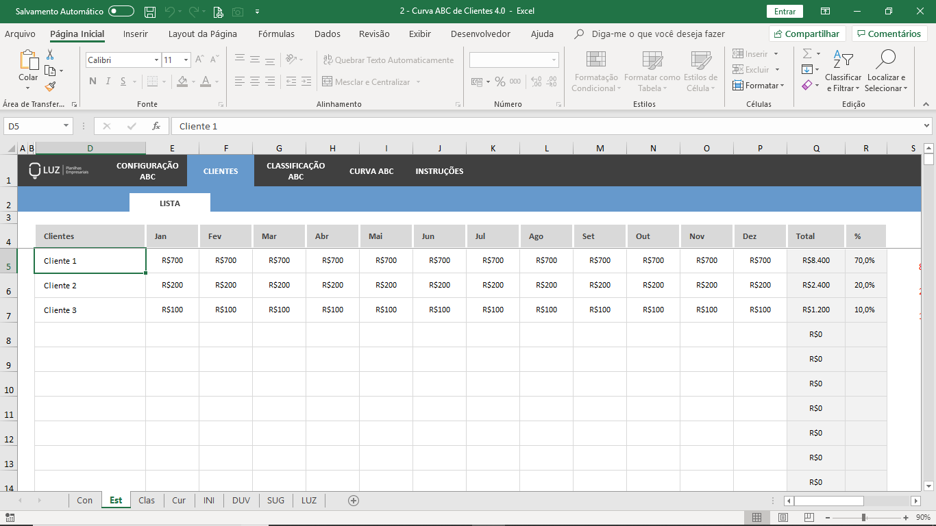 Ranking do cliente que mais gerou receitas para o seu negócio até o que gerou menos, mostrando a classificação ABC de cada um deles de acordo com a configuração realizada no início da planilha