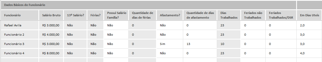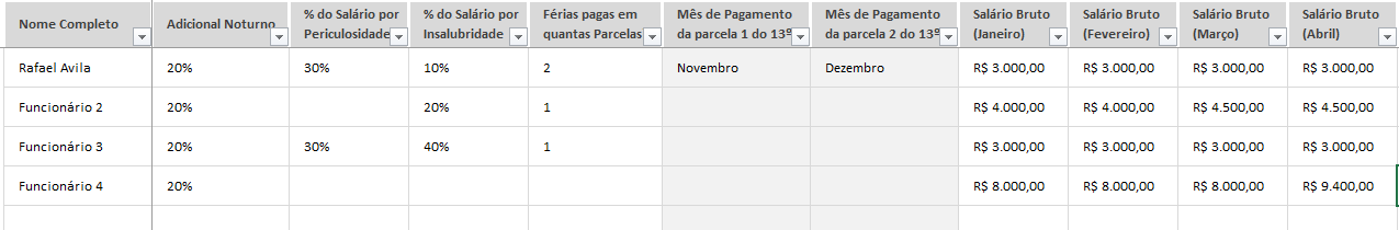 Cadastre até 50 funcionários por planilha, informando os dados pessoais, cargo, salário, número de dependentes e período de férias.