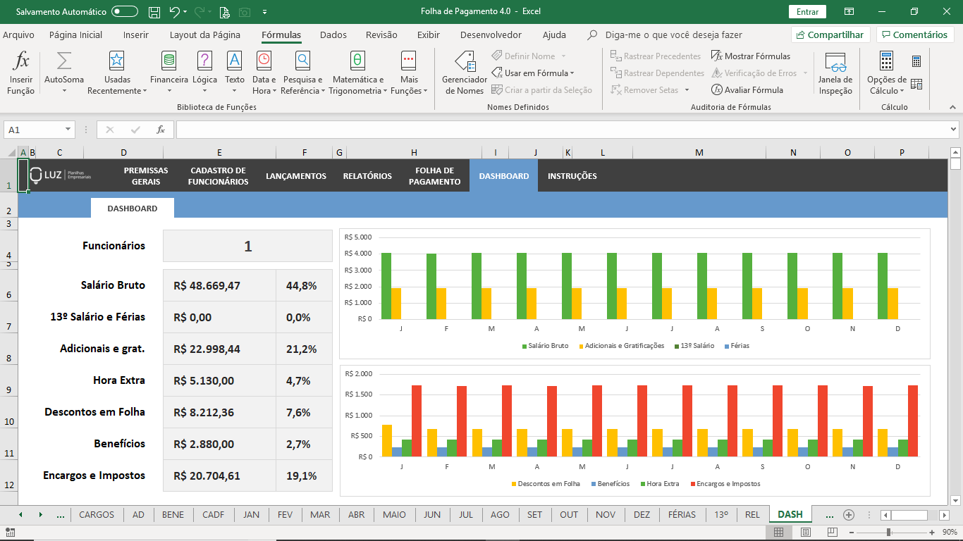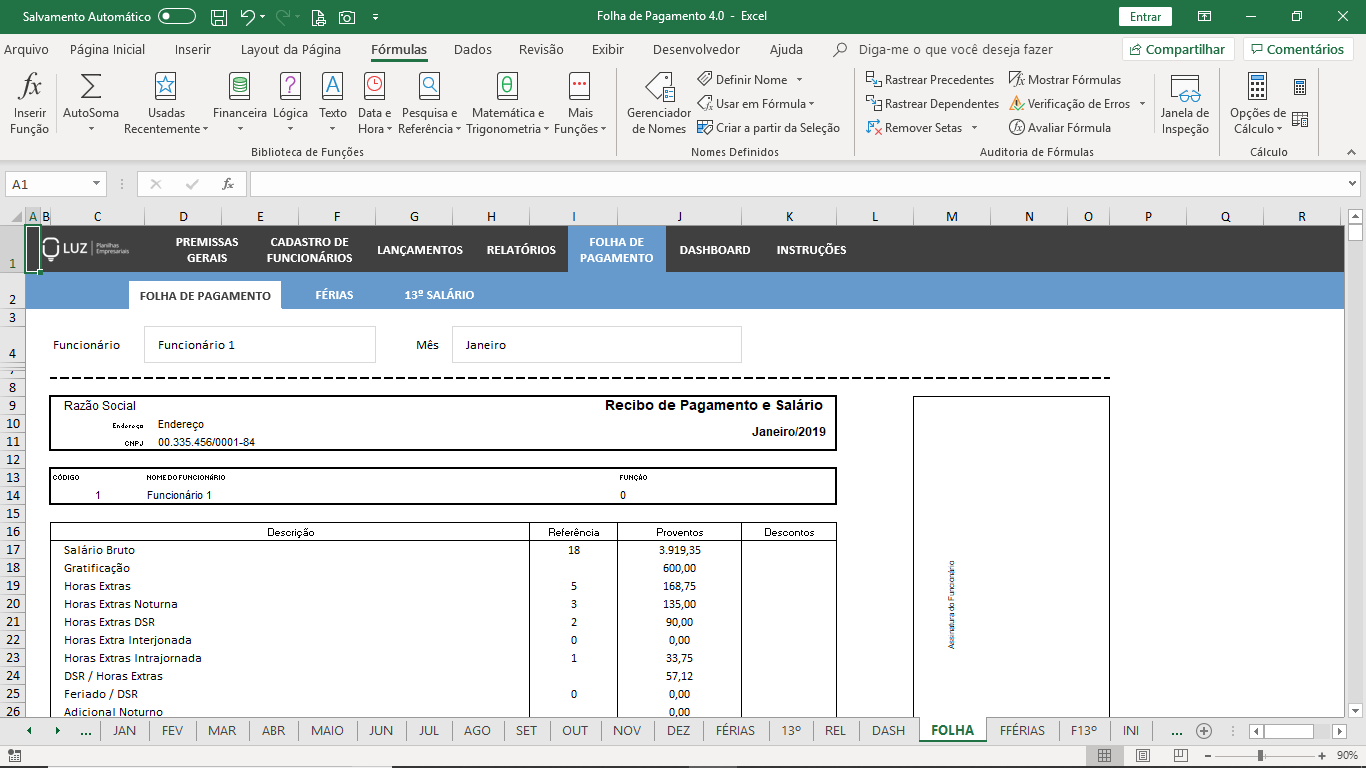 Imprime holerites, comprovante de férias e décimo terceiro. Essa planilha vai lhe ajudar a organizar todo seu processo de folha de pagamento de funcionários e ter uma visão exata de todos os custos!